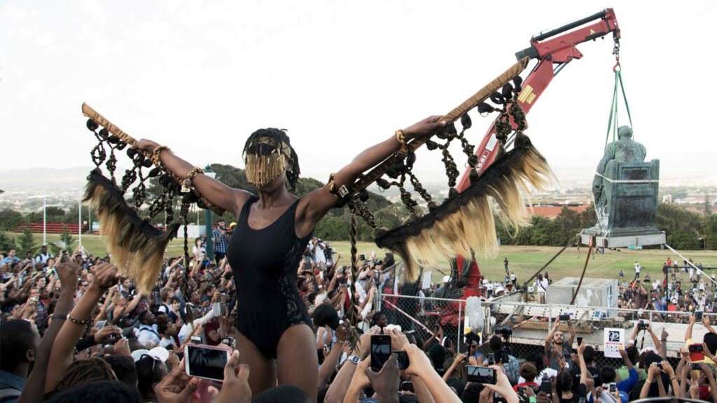 É nesse contexto que devem ser apreendidos os movimentos estudantis iniciados em março: nos marcos da crise do regime pós-apartheid. No dia 9 de março, o estudante da Universidade da Cidade do Cabo (UCT) Chumani Maxwele deflagrou o movimento que viria a se chamar Rhodes Deve Cair (Rhodes Must Fall). Com mais uma dúzia de colegas, Chumani atirou fezes humanas sobre a estátua de Cecil Rhodes, um notório colonizador britânico, demandando sua retirada do campus da universidade em meio a danças de protesto (toyi-toyi). A campanha se alastrou rapidamente, se autodeclarando um “movimento coletivo de estudantes e funcionários mobilizados para ação direta contra a realidade do racismo institucional na universidade” e demandando a “descolonização” da educação. Em 9 de abril a estátua finalmente foi removida, após deliberação do conselho universitário.